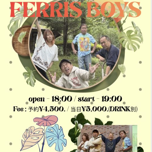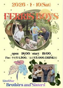1/10(Sat) FERRIS BOYS 1月 10 Sat 2026 LIVEopen - 18:00 / start - 19:00 Fee : 予約¥4,500. / 当日¥5,000.(DRINK別)Screenshot ← →