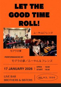1/17(Sat) LET THE GOOD TIME ROLL ! 1月 17 Sat 2026 LIVE出演 : モグラの夢・ふーやん&フレンズ open - 18:00 / start - 18:30 Fee : ¥2,500.(DRINK別) ← →