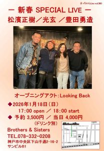 1/18(sun) 〜新春 SPECIAL LIVE〜 松濱正樹・光玄・豊田勇造 1月 18 Sun 2026 LIVEopen - 17:00 / start - 18:00 Fee : 予約¥3,500. / 当日¥4,500.(DRINK別) ← →