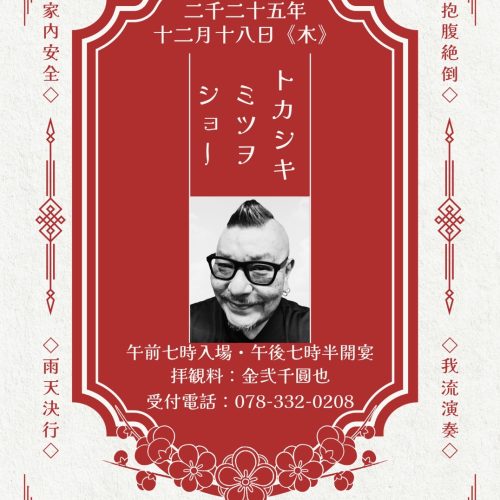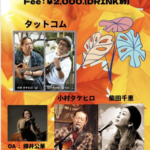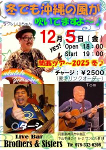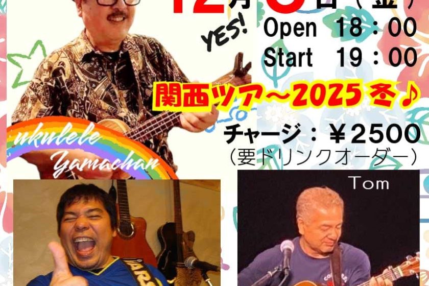 12/5(Fri) ウクレレ山ちゃん 関西ツアー 2025冬♪ 12月 5 Fri 2025 LIVE【出演 : ウクレレ山ちゃん・Tah ◎ shi・Tom open - 18:00 / start - 19:00 Fee : ¥2,500.(DRINK別) ← →