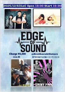 12/6(Sat) EDGE of SOUND 12月 6 Sat 2025 LIVE出演 : SORE'078・シーモンキー・Shiny Pink・Cozmic Spoon open - 18:00 / start - 18:30 Fee : ¥2,000.(DRINK別)Screenshot ← →