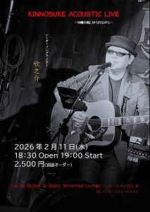 2/11(Wed) KINNOSUKE ACOUSTIC LIVE!〜沖縄の風にゆられながら〜 2月 11 Wed 2026 LIVEopen - 18:30 / start - 19:00 Fee : 2,500.(DRINK別) ← →