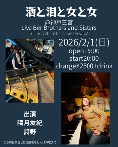 2/1(Sun) 酒と涙と女と女! 2月 1 Sun 2026 LIVE【出演 : 陽月友紀 / 詩野】 open - 19:00 / start - 20:00 Fee : ¥2,500.(DRINK別) ← →