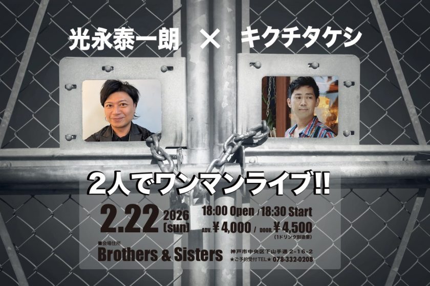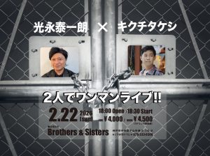 2/22(Sun) 光永泰一朗 ✖️ キクチタケシ 2人でワンマンライブ! 2月 22 Sun 2026 LIVEopen - 18:00 / start - 18:30 Fee : ADV.¥4,000. / DOOR.¥4,500.(DRINK別) ← →
