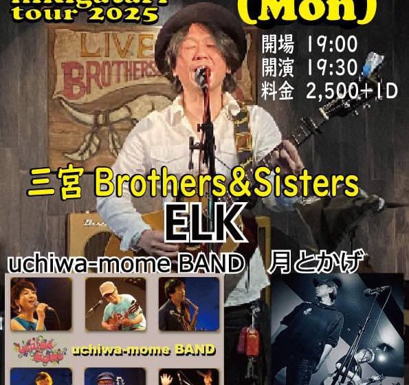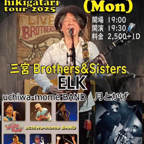 4月28日(月) ELK hikigatari tour 2025! 4月 28 Mon 2025 LIVEact : ELK / uchiwamome BAND / 月とかげ open - 19:00 / start - 19:30 Fee : ¥2,500.(DRINK別) ← →