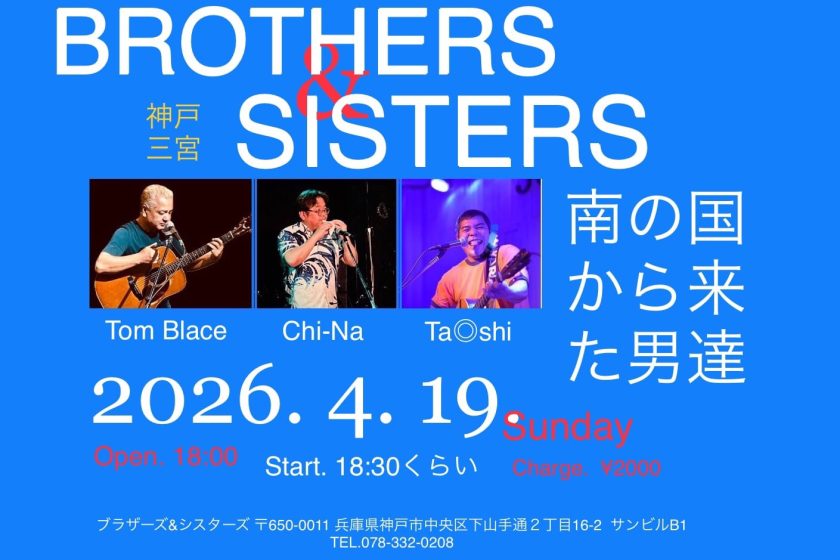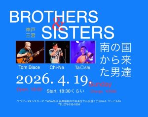 4/19(Sun) 南の国から来た男達! 4月 19 Sun 2026 LIVEact : Tom Blace・Chi-Na・Ta ◎ shi open - 18:00 / start - 18:30 Fee : ¥2,000.(DRINK別) ← →