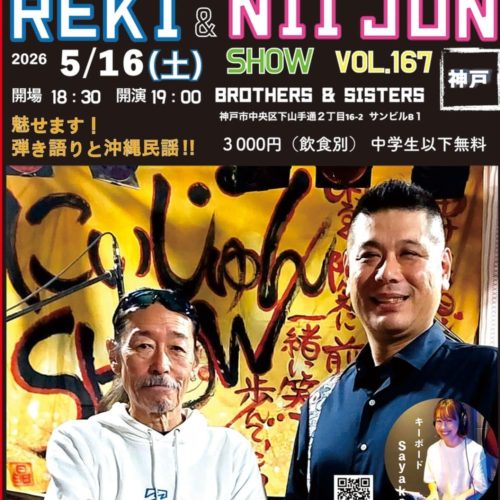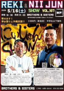5/16(Sat) REKI & NII JUN SHOW VOL.167 〜魅せます!弾き語りと沖縄民謡〜 5月 16 Sat 2026 LIVEopen - 18:30 / start - 19:00 Fee : ¥3,000.(DRINK別) ← →