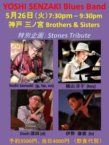5/26(Tue) YOSHI SENZAKI Blues Band! 5月 26 Tue 2026 LIVESupport Musician : 横山淳子(Pf)・Doch深田(Dr)・伊勢康俊(Bass) open - 19:00 / start - 19:30 Fee : 予約¥3,500. / 当日¥4,000.(DRINK別) ←