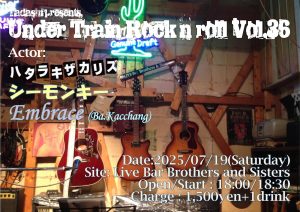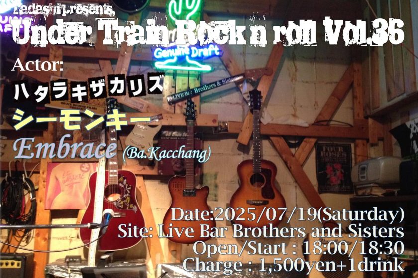 7/19(Sat) “Tadashi Presents” Under Train Rockn’ Roll vol.36 7月 19 Sat 2025 LIVEact : ハタラキザカリズ / シーモンキー / Embrace open - 18:00 / start - 18:30 Fee : ¥1,500.(DRINK別)1 2 ← →