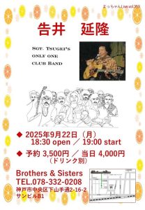 9/22(Mon) 告井延隆! 9月 22 Mon 2025 LIVEopen - 18:30 / start - 19:00 Fee : 予約¥3,500. / 当日 ¥4,000.(DRINK別) ← →